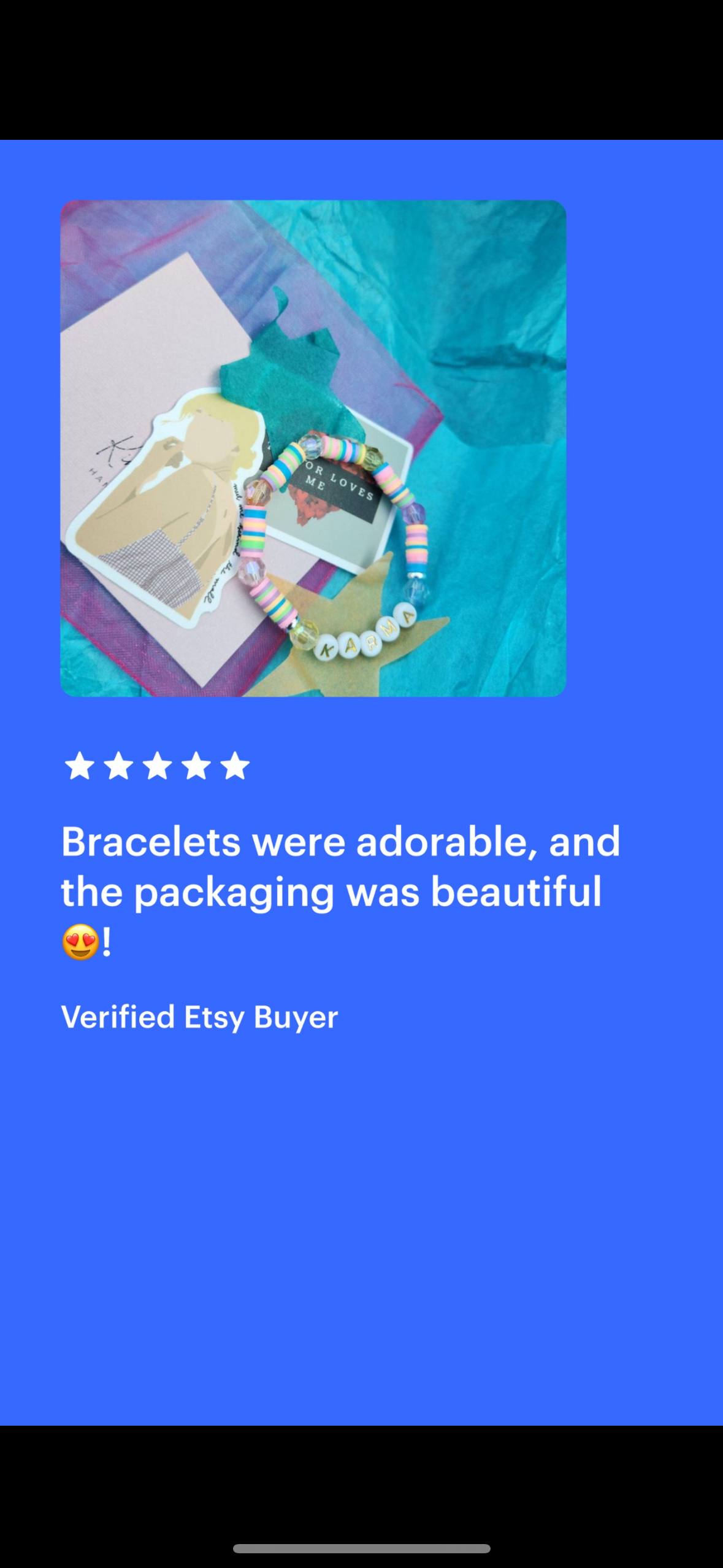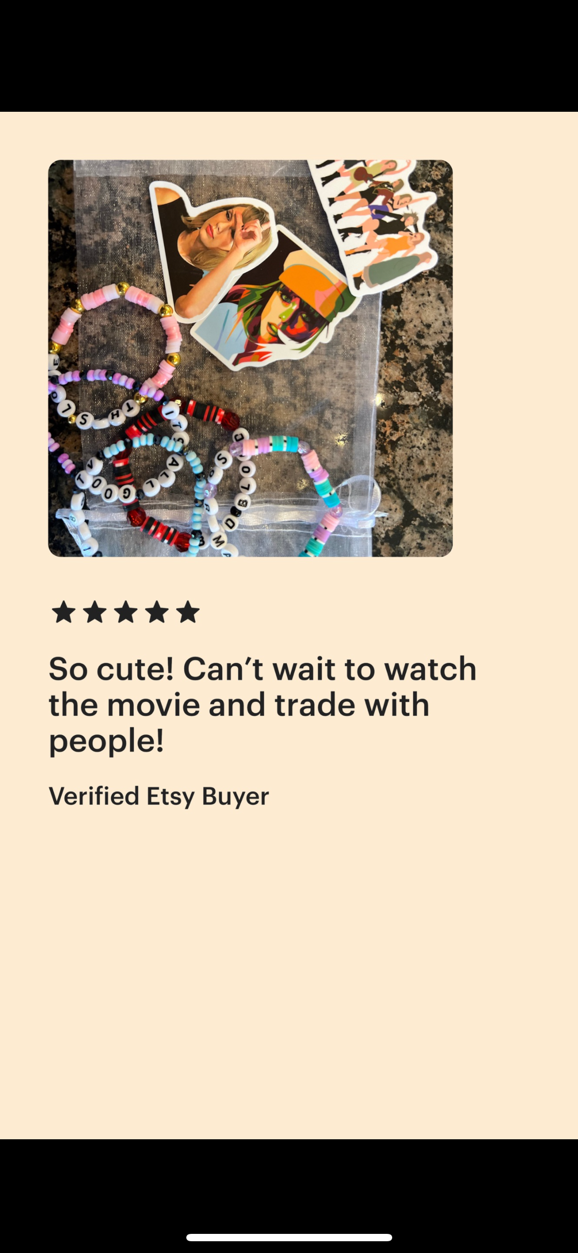 Each bracelet showcases a unique Taylor song, album, or lyric (we never make 2 of the same bracelets)! Our bracelets are assorted- some are made with clay discs, spacer beads, glass beads, mini beads, etc. They're all made with standard size stretchy cord and they stretch to fit over your hand.